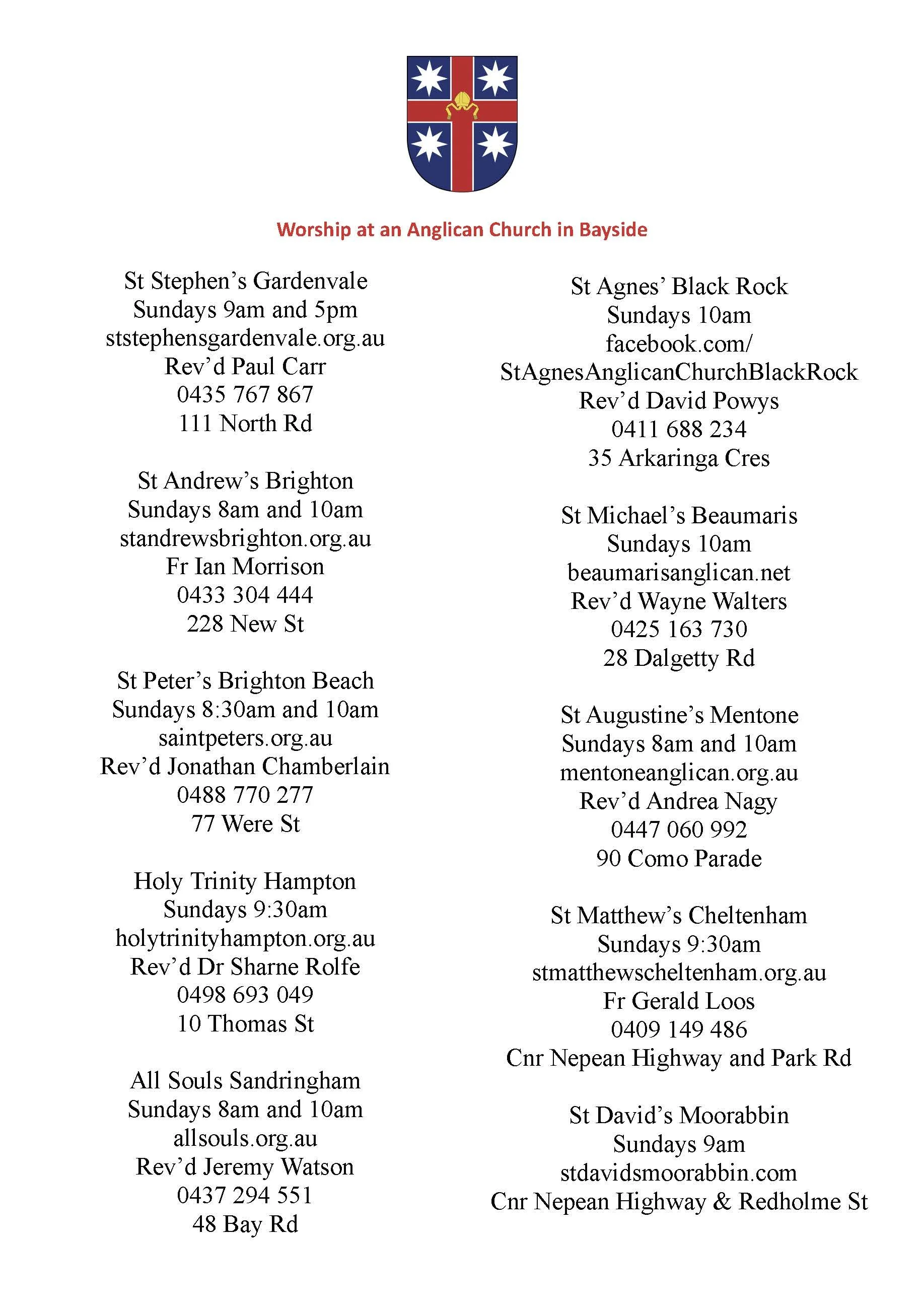 Please click on the links below for more information on each of the Anglican Parishes in Bayside